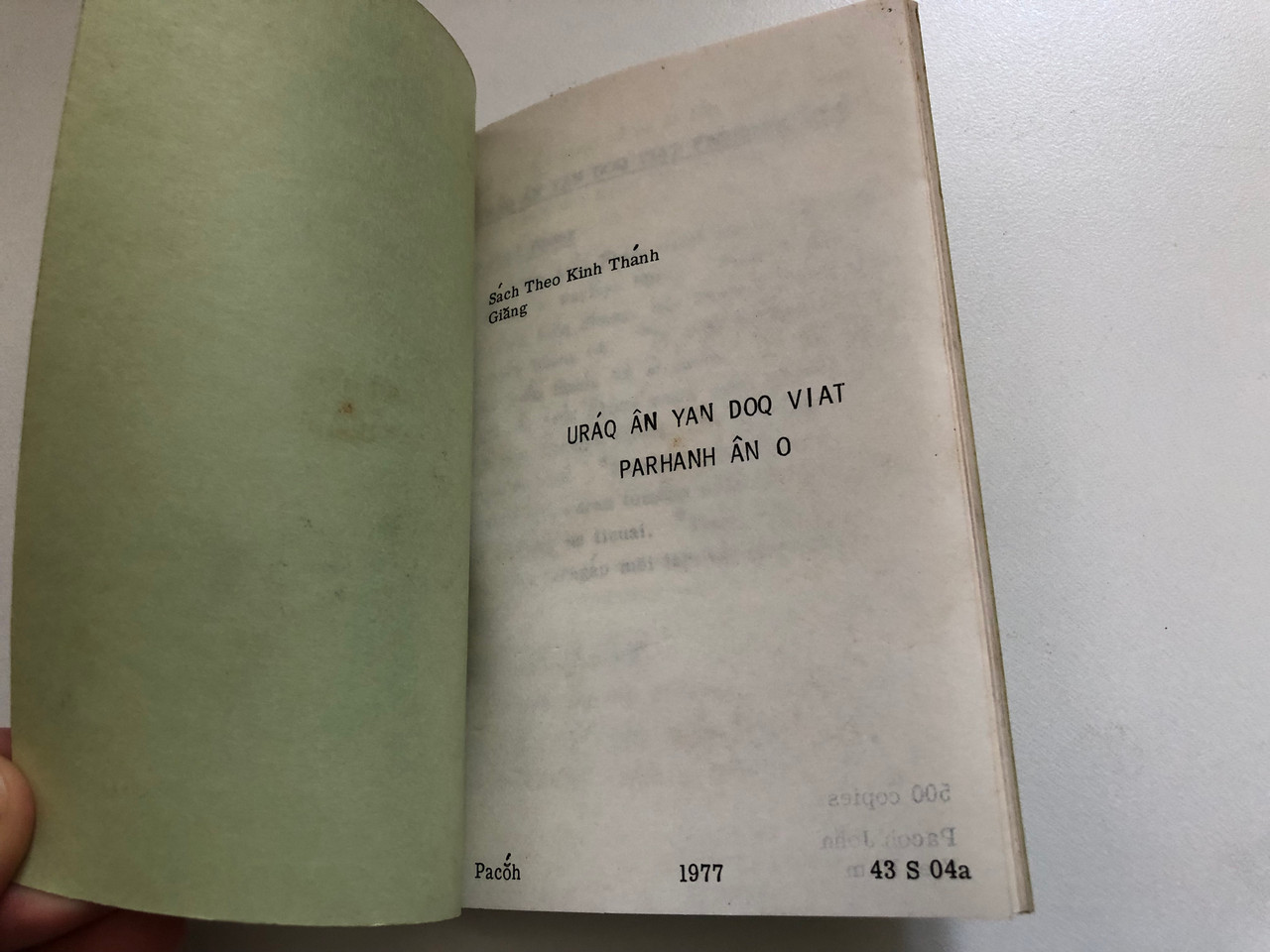 This booklet presents the Gospel of John translated into the Pacoh language, a minority language spoken by communities in Vietnam and Laos. Published in 1977, it offers an accessible scriptural resource to Pacoh-speaking Christians, enabling them to engage with the life and teachings of Jesus Christ in their native tongue.