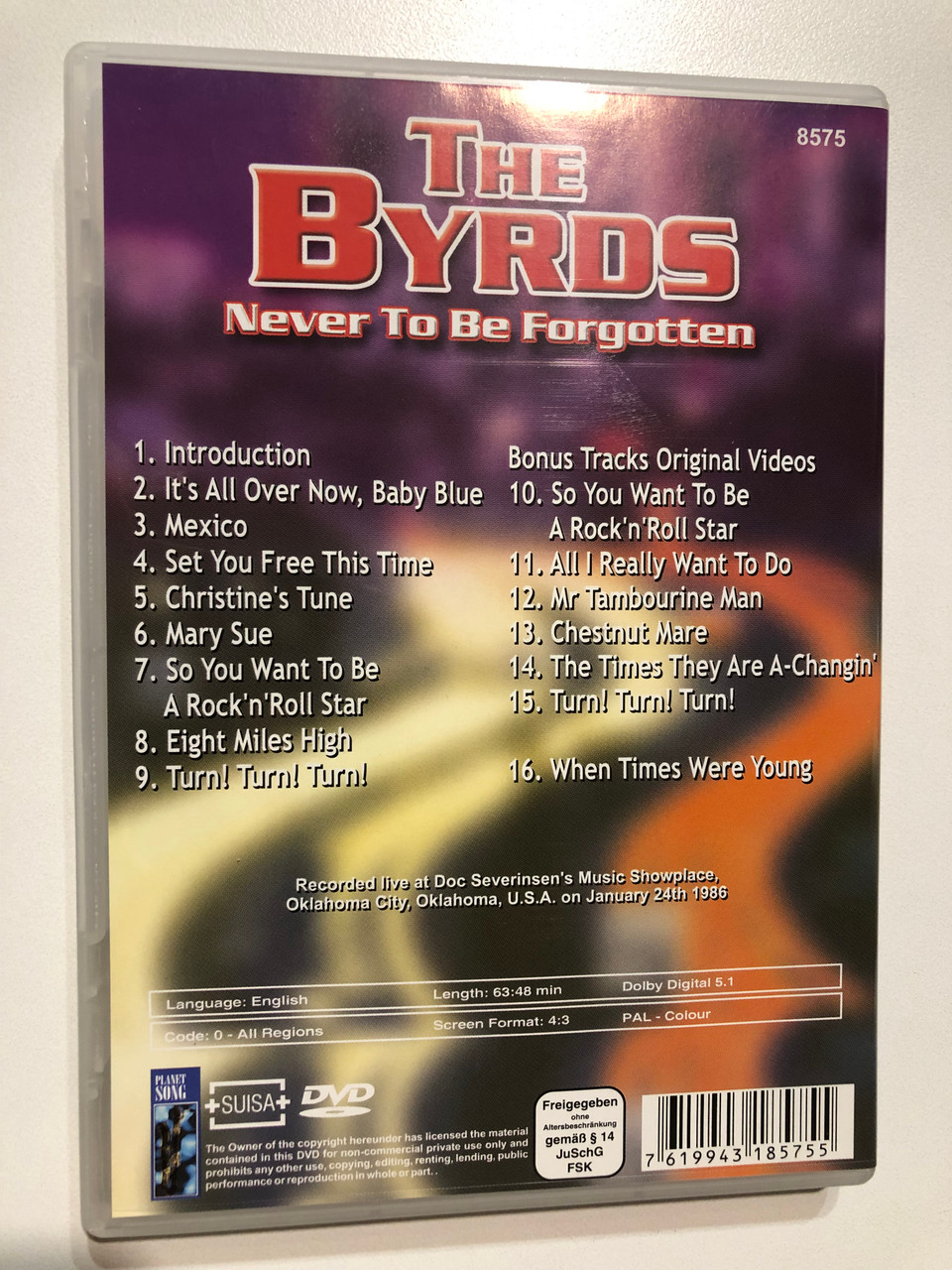 Revisit the legendary performance of The Byrds with "Never To Be Forgotten", a live recording captured at Doc Severinsen's Music Showplace in Oklahoma City on January 24, 1986. This DVD brings to life the timeless sound of one of the most influential bands in rock history, featuring a setlist of their iconic tracks and bonus video performances. Experience classics like "Turn! Turn! Turn!", "Eight Miles High", and "Mr. Tambourine Man" in this nostalgic journey through their musical legacy.